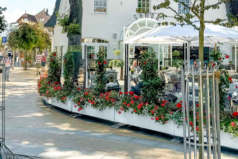 Wysoka stała osłona przeciwwiatrowa jako sekcja wolnostojąca poprzez połączenie CiUWindscreen z donicą lub ławką.